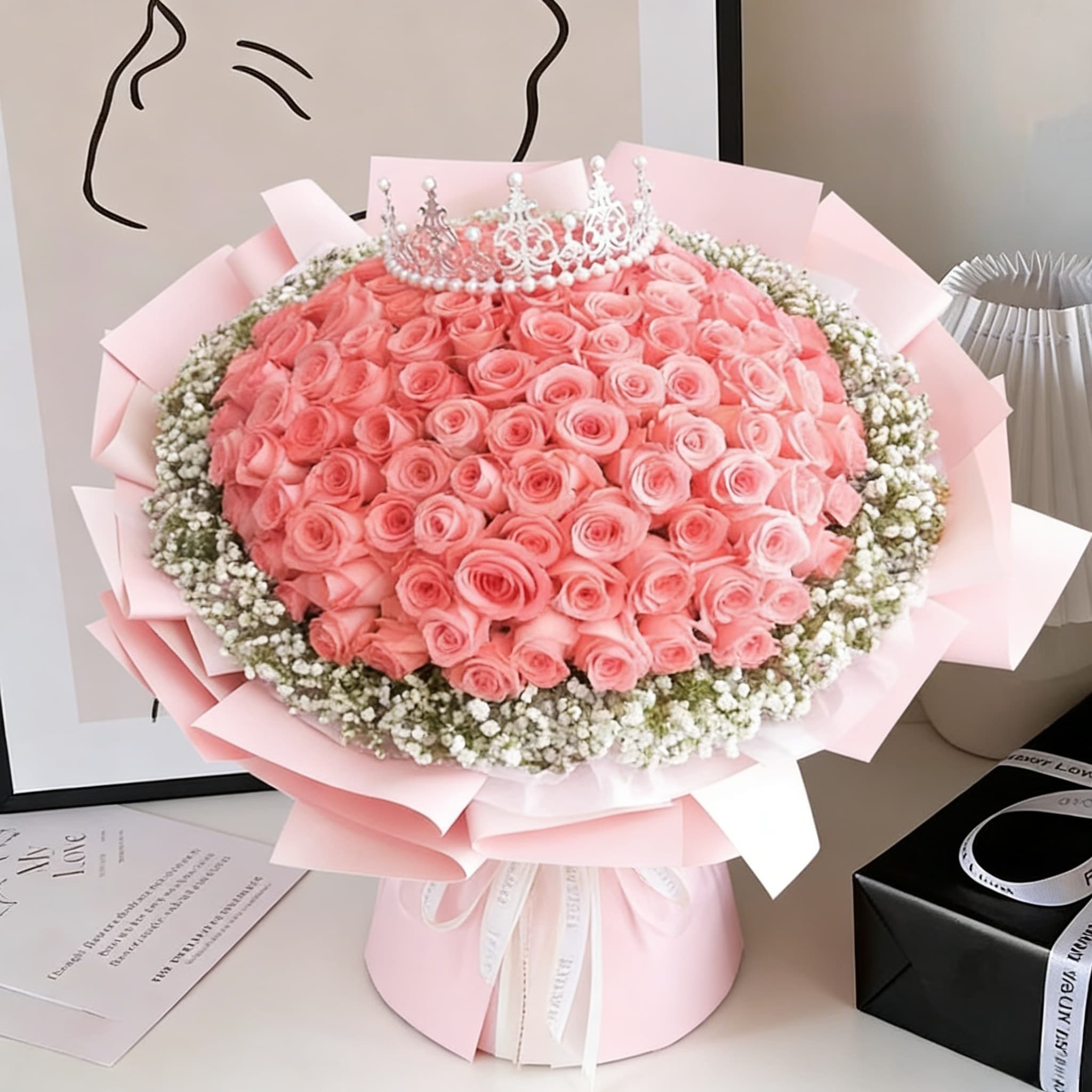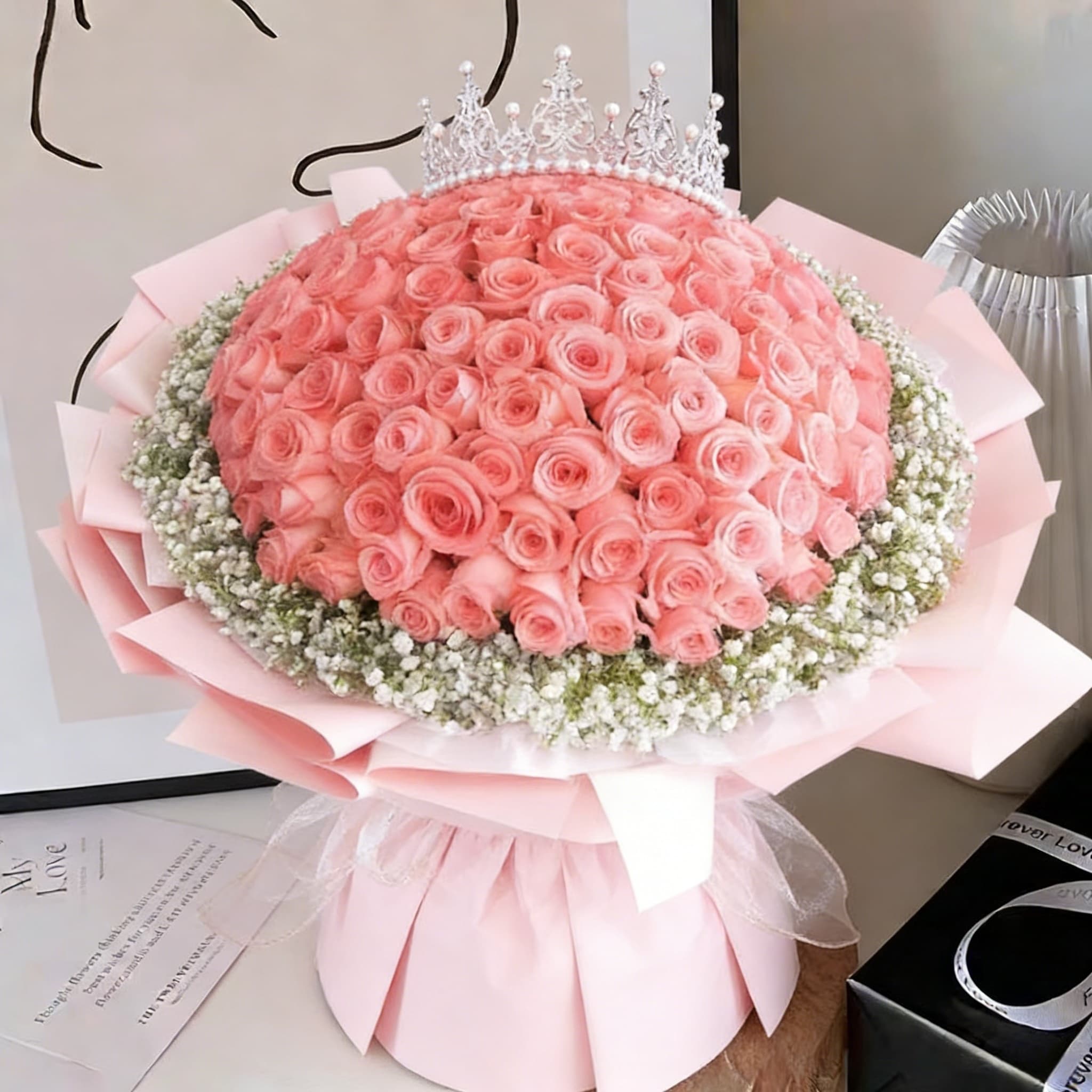粉色硬质包装纸,顶部装饰珍珠皇冠