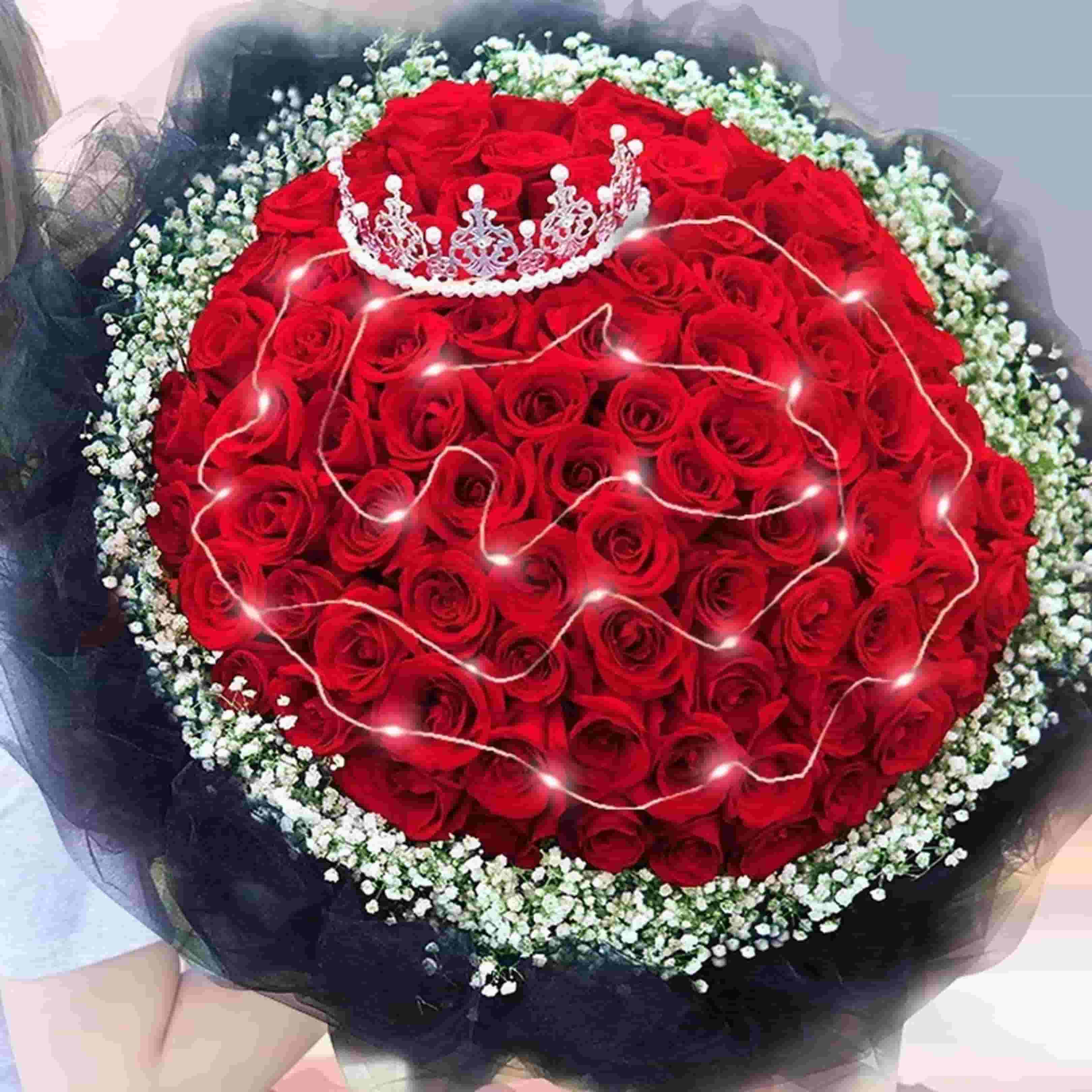 红玫瑰(主花),白色满天星(配花),搭配金色皇冠装饰与暖光串灯