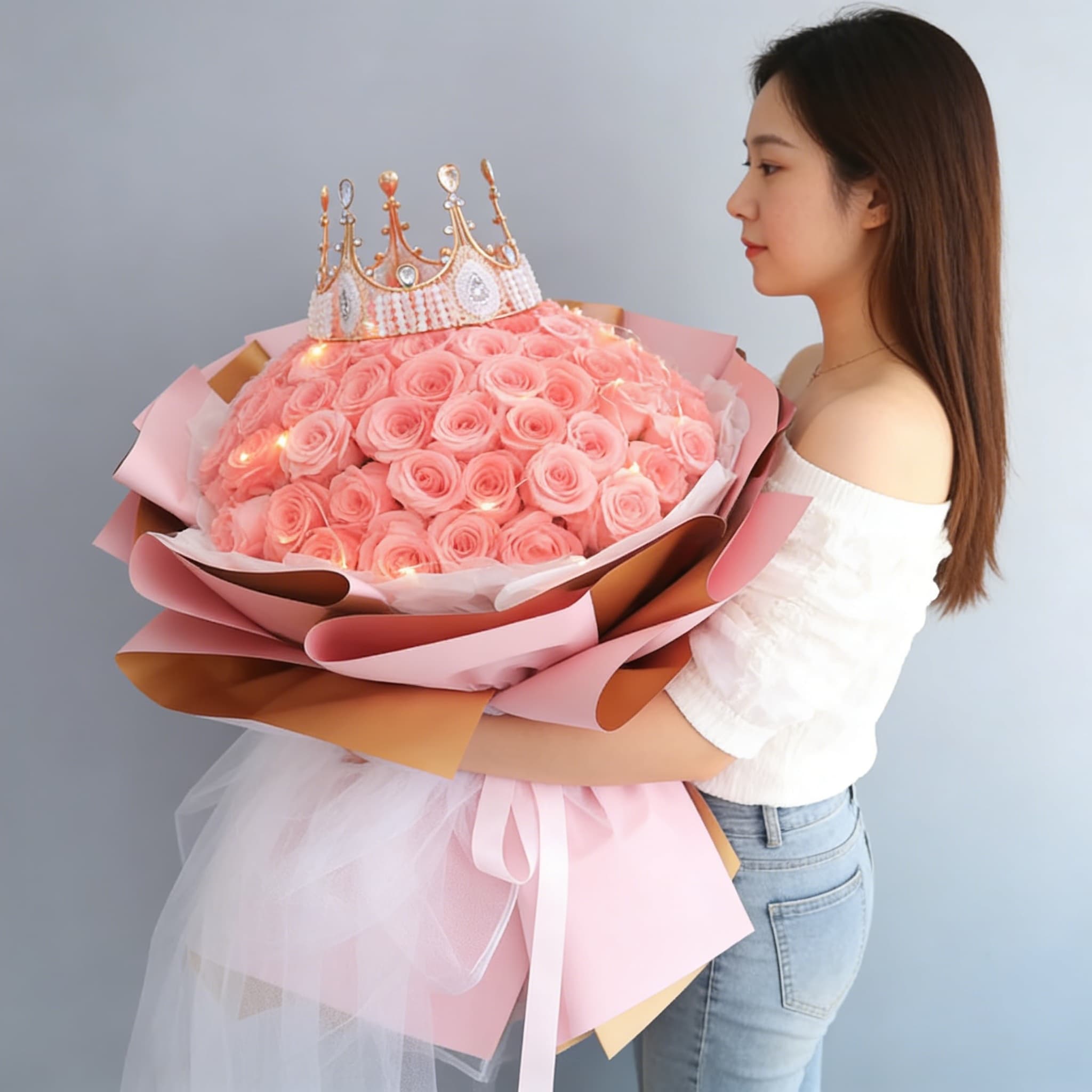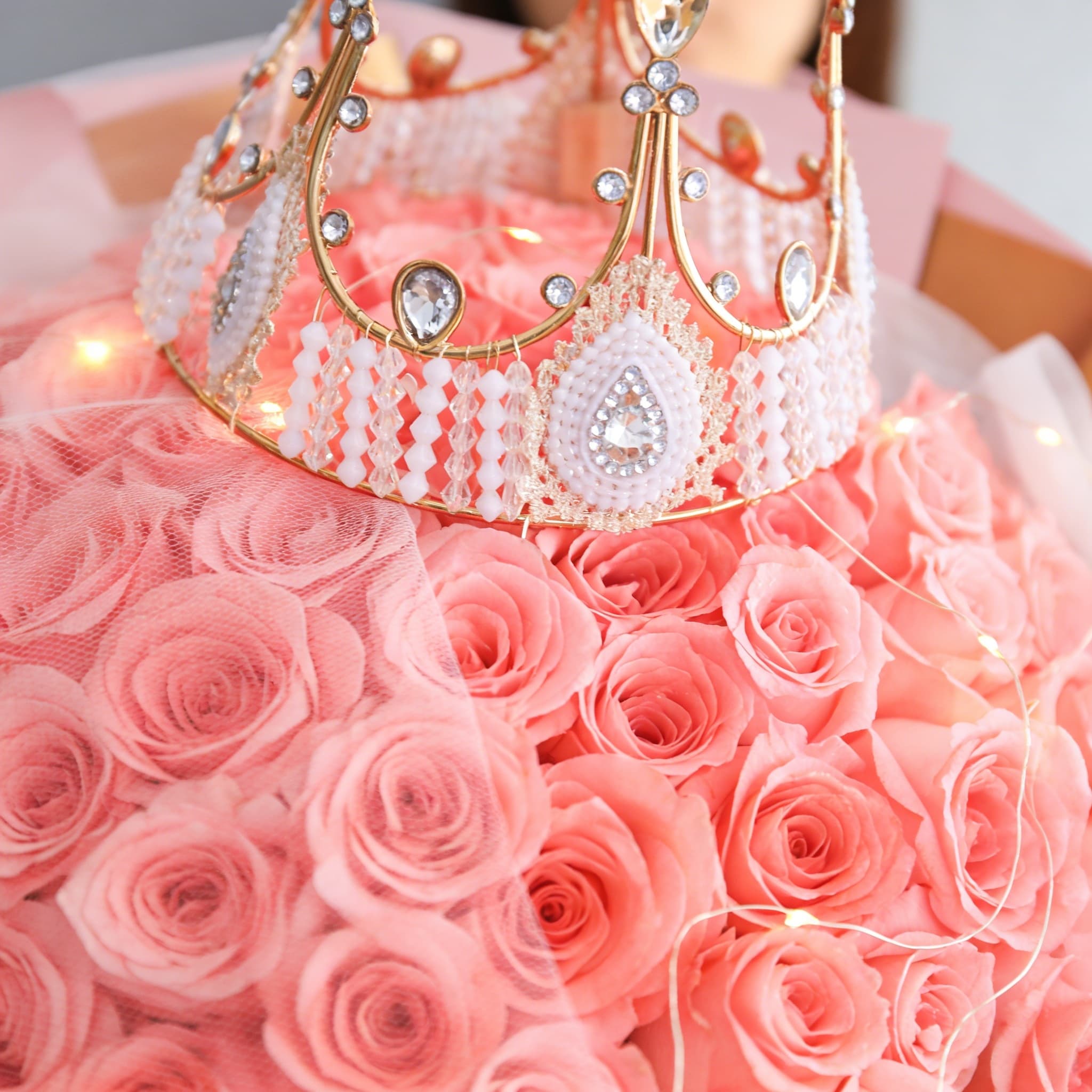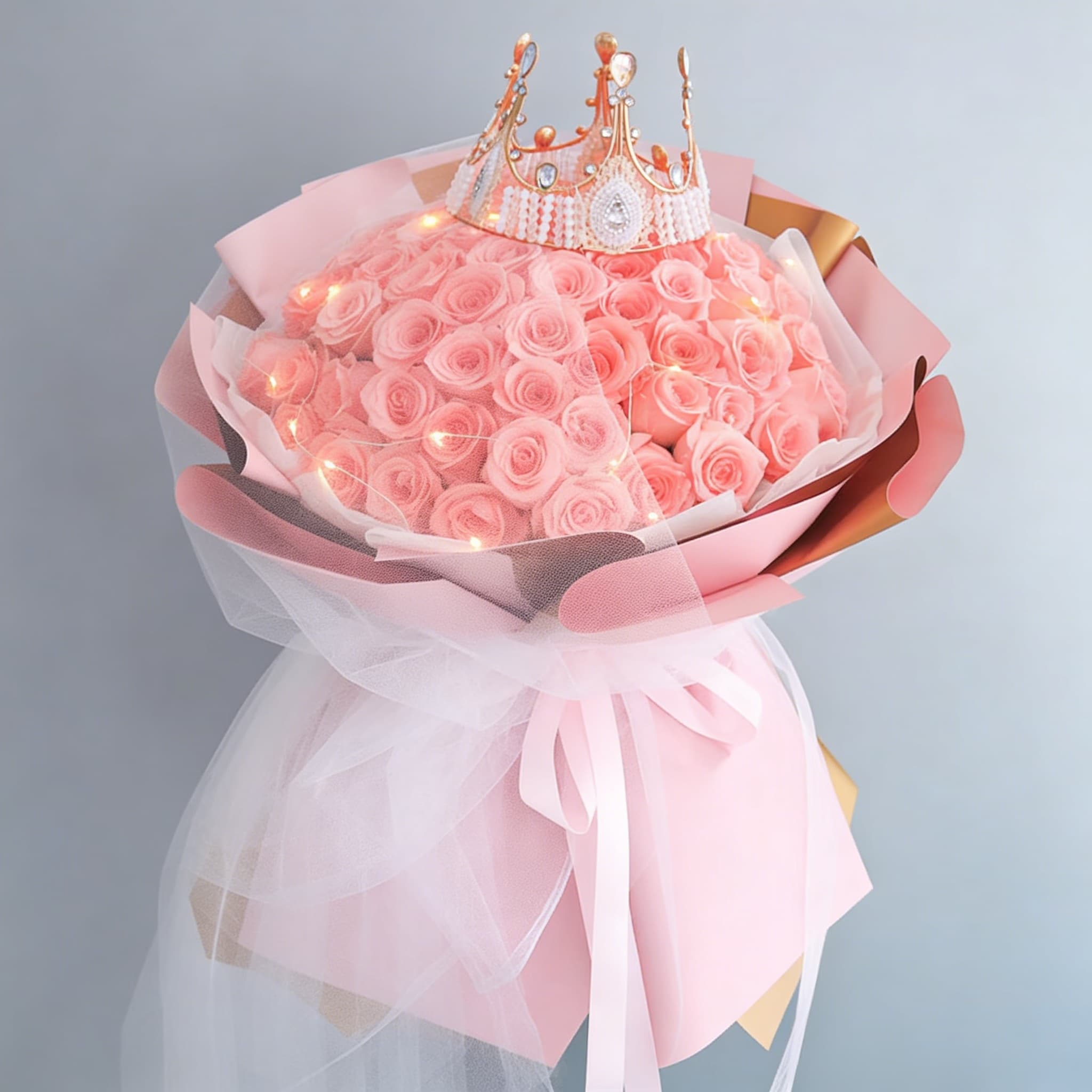 粉玫瑰(主花),搭配金色皇冠装饰与暖光串灯