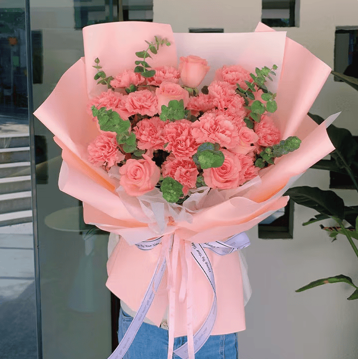 粉康乃馨(主花),粉玫瑰(主花),尤加利叶(配草)