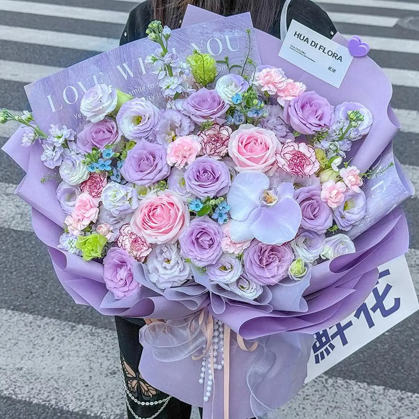 内层为浅紫色半透包装纸,外层为深紫色硬质包装纸,底部系有浅粉色缎带蝴蝶结与珍珠装饰