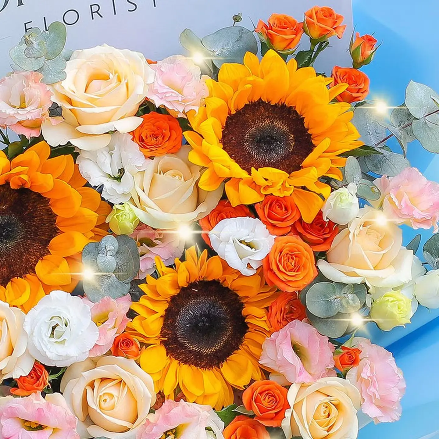 向日葵(主花),香槟玫瑰(主花),粉色洋牡丹(配花),橙色小菊(配花),白色桔梗(配花),尤加利叶(配草)
