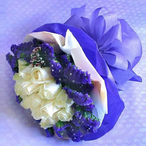 主要花材:1枝粉绣球,16枝粉玫瑰,5枝粉桔梗,11枝粉康乃馨,11枝栀子叶,9枝尤加利叶,粉白色双面包装多层精美,黑色字母缎带蝴蝶结,三脚架一个