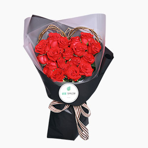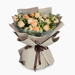 主要花材:1枝粉绣球,16枝粉玫瑰,5枝粉桔梗,11枝粉康乃馨,11枝栀子叶,9枝尤加利叶,粉白色双面包装多层精美,黑色字母缎带蝴蝶结,三脚架一个