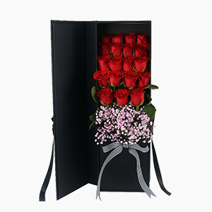 主要花材:1枝粉绣球,16枝粉玫瑰,5枝粉桔梗,11枝粉康乃馨,11枝栀子叶,9枝尤加利叶,粉白色双面包装多层精美,黑色字母缎带蝴蝶结,三脚架一个