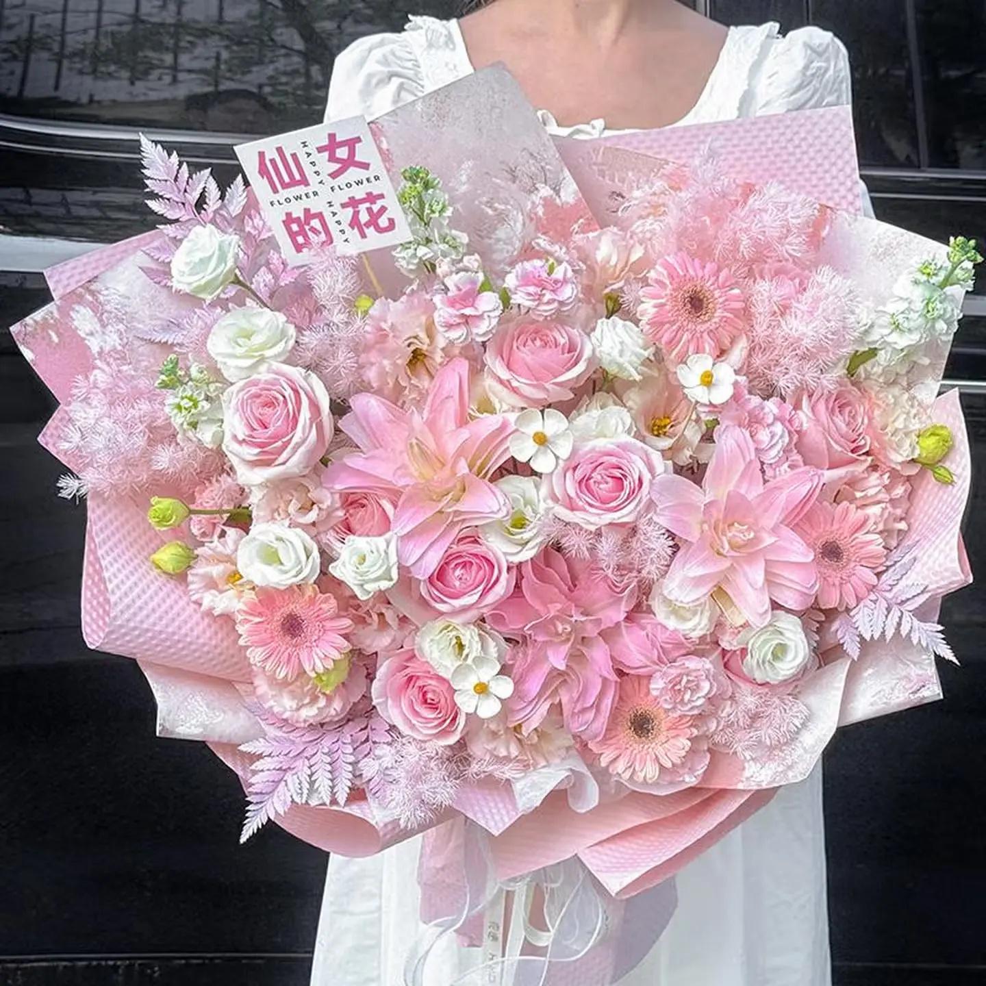 粉玫瑰(主花),粉百合(主花),粉色扶郎花(配花),白色桔梗(配花),喷泉草(配草)